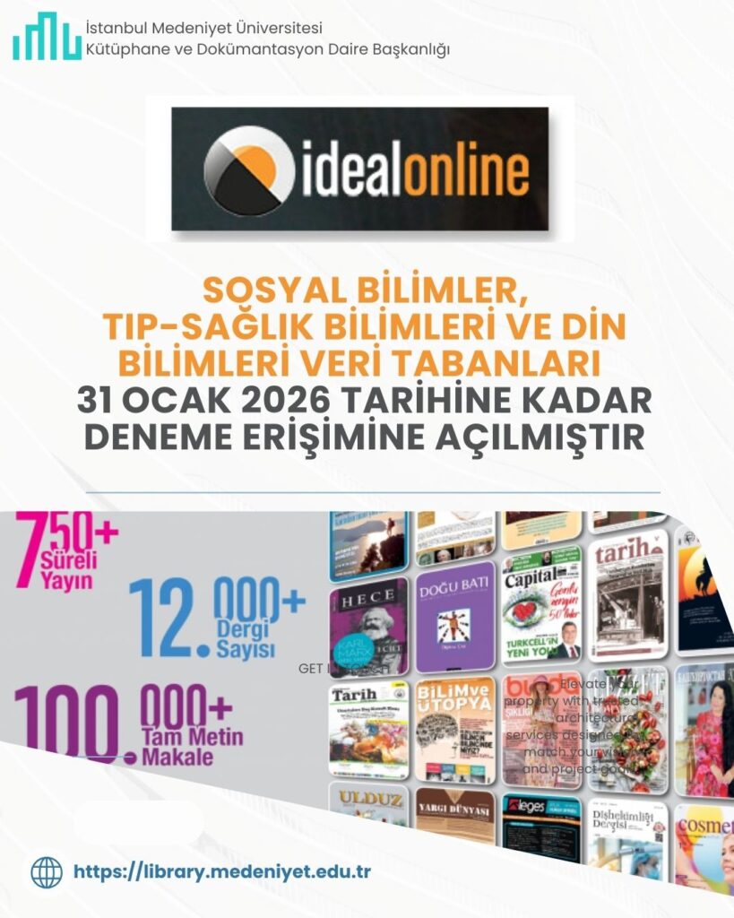 21 Ocak 202621 Ocak 2026 İdealonlne Sosyal Bilimler, Tıp-Sağlık Bilimleri ve Din Bilimleri Veri Tabanları 31 Ocak 2026 tarihine kadar deneme erişimine açılmıştır