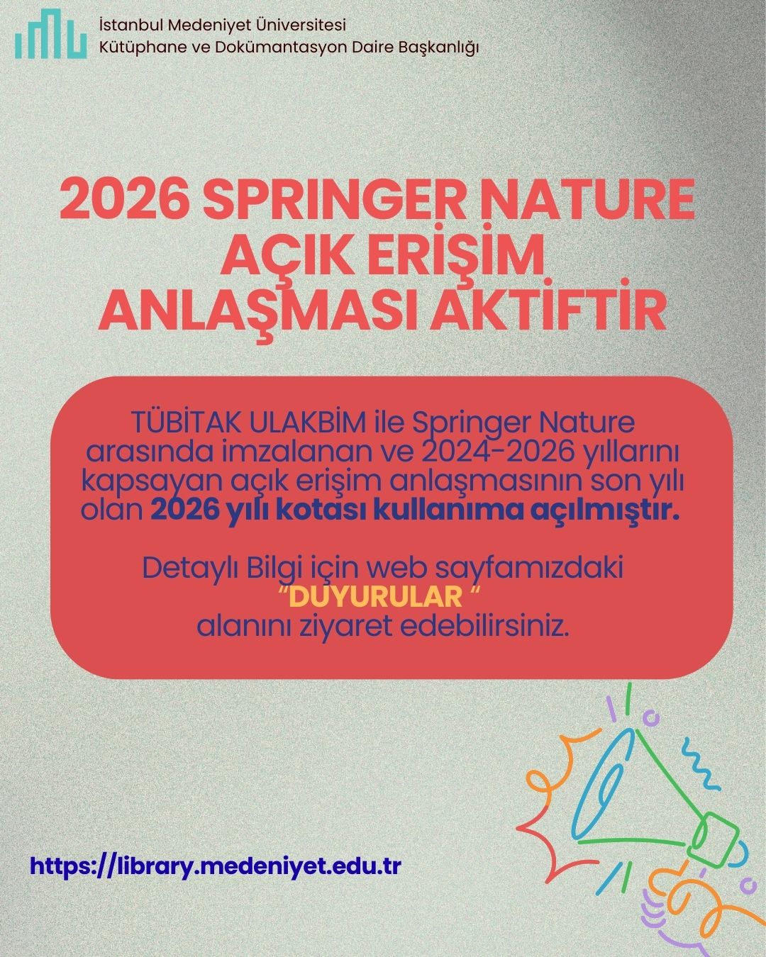 İstanbul Medeniyet Üniversitesi mensubu araştırmacılar, Springer Nature bünyesindeki seçilmiş hibrit dergilerde, herhangi bir APC (Makale İşlem Ücreti) ödemeden makalelerini “Açık Erişim” olarak yayımlayabilmektedir.